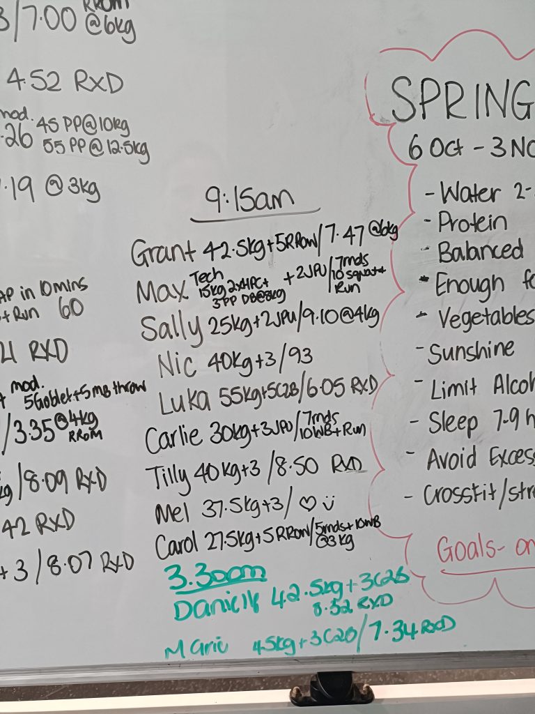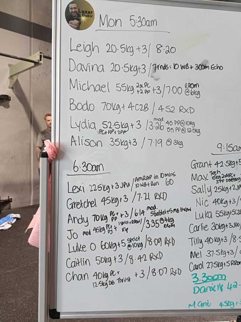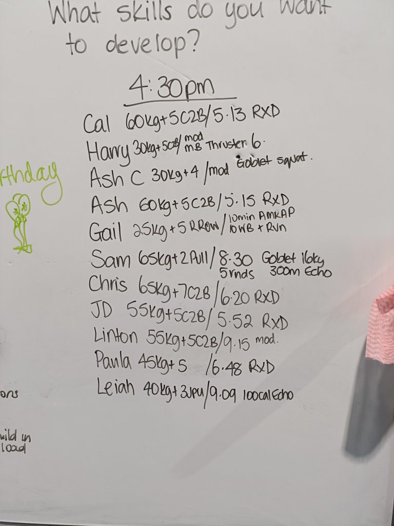 Min 1: Power Clean + Hang Squat Clean + 2 Thrusters